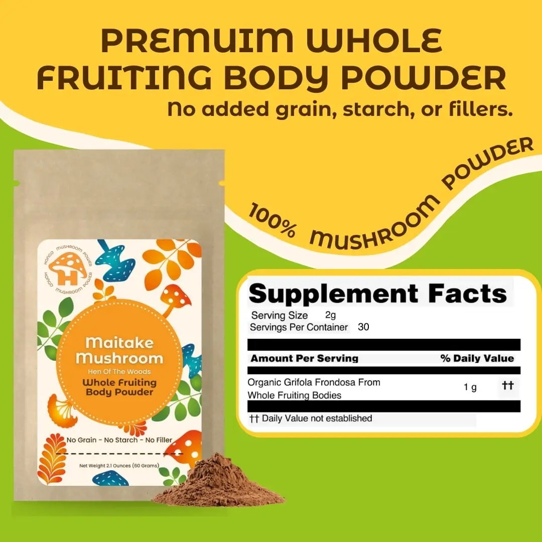 Unlock the power of Maitake with our premium Mushroom Powder. Each pouch contains 60g of finely-ground, 100% pure fruiting body, free from any grains, additives, or fillers. Known for its immune-boosting and antioxidant properties, this versatile powder can be added to your favorite beverages or meals. Elevate your daily health routine naturally with our organic Maitake Mushroom Powder. Shop now to harness the benefits of this remarkable superfood.
