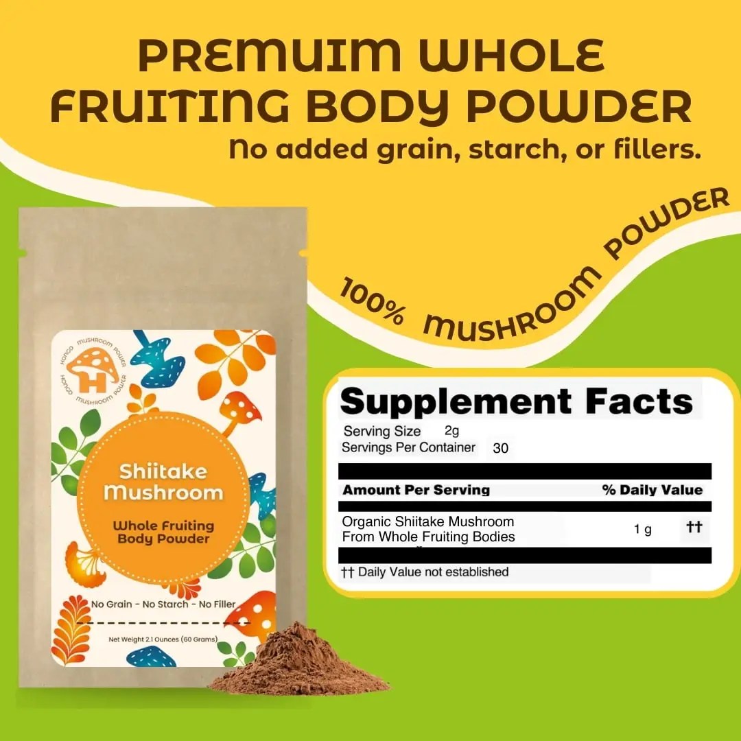 Incorporating our Shiitake Mushroom Whole Fruiting body powder into your diet is an easy way to promote overall health and well-being. Add it to your soups, stews, or smoothies for an extra nutritional boost. Our Shiitake Mushroom Whole Fruiting body powder is vegan, non-GMO, and free from any fillers or additives.